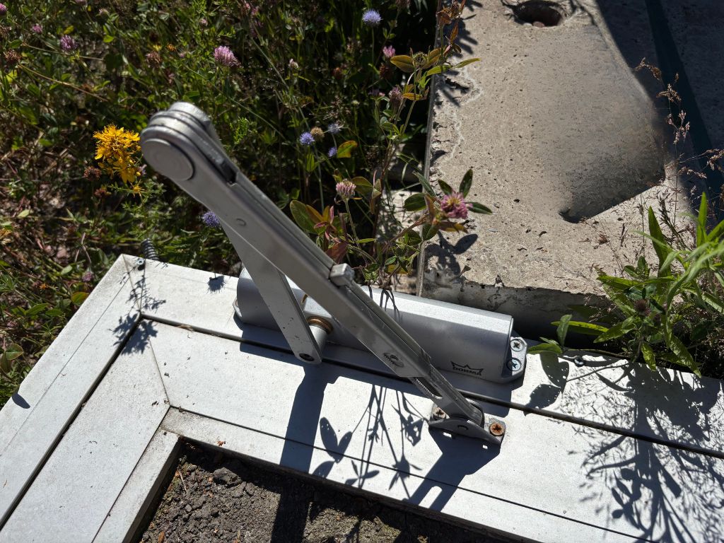 1st högerhängd (utifrån sett) med en Dorma dörrstängare och nödutrymningsbeslag