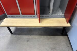 Tillhörande sittbänk i trä med svart stativ