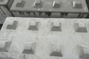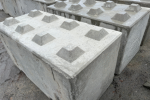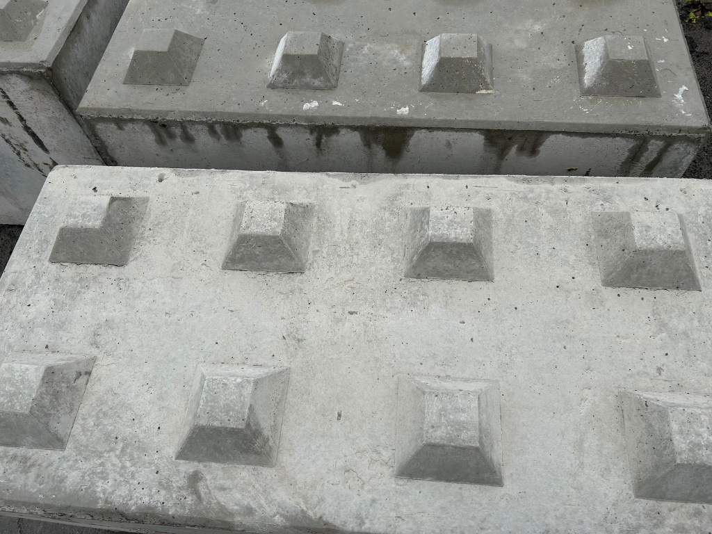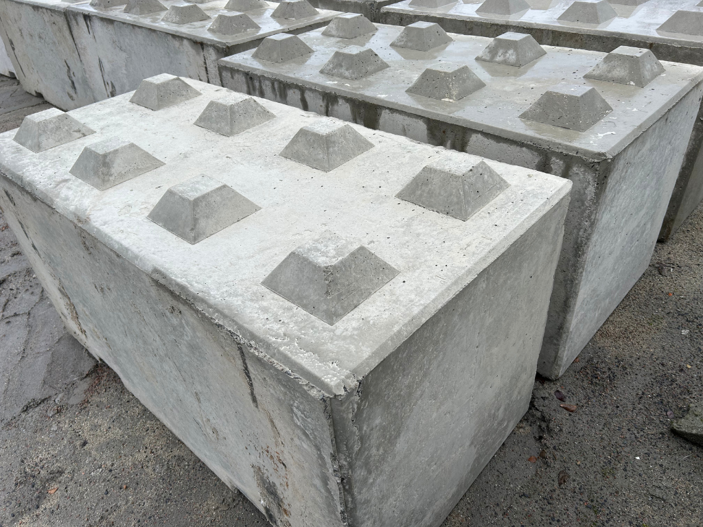 Staplingsbara betongblock med knoppar på ovansidan och urtag i nederkant för enkel hantering och stabil stapling.