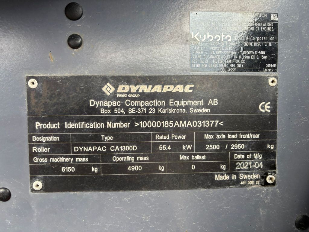 Fabeo, Dynapac, CA1300D, Envalsvält, Vält, Vibro, Kubota, Kompakt vält, CE-märkt, Anläggningsmaskin