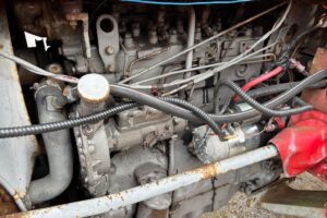 Den läcker lite diesel vid pumpen och lite vatten från kylarslangen.