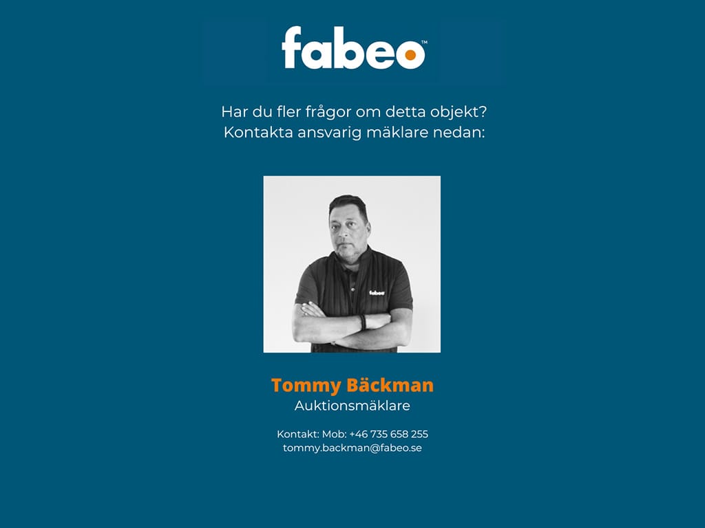 Du som köpare skall alltid kontrollera objektet vid avhämtning. Eventuella anmärkningar härefter beaktas inte. Om objektet skiljer sig väsentligt från objektsbeskrivningen skall Fabeo kontaktas innan objektet transporteras.